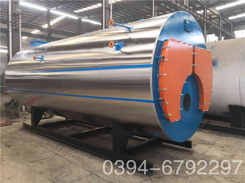 WNS系列蒸汽锅炉是锅壳式、波形炉胆、螺纹烟管型节能锅炉,采用三回程湿背式结构,燃料在炉胆内燃烧产生高温烟气,经回燃室→对流管束→前烟箱→第二对流管束→后烟箱→常压冷凝器→烟囱排入大气。炉胆在设计中采用波形炉胆,能较好的与火焰形状相适应,保证了燃烧充分,波形炉胆降低了炉胆刚性,减小了变形应力,可保证制造质量。同时在回燃室安装了检查孔或弹簧式防爆检查门,本体上设置的人孔有利于锅炉的安全运行及维修。锅炉安全控制严格按照NB/T47034-2013《工业锅炉技术条件》和有关规程规定执行。